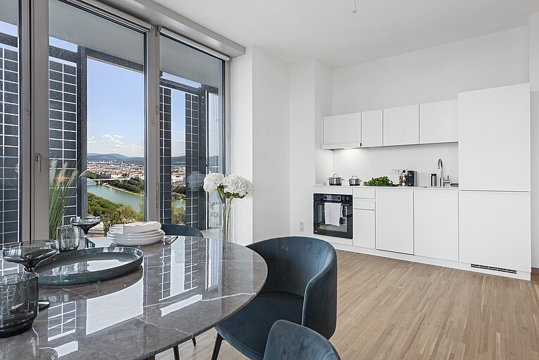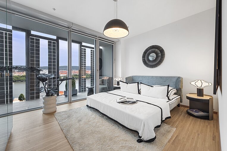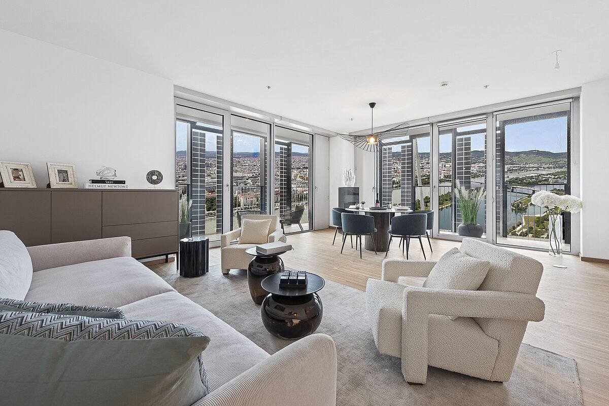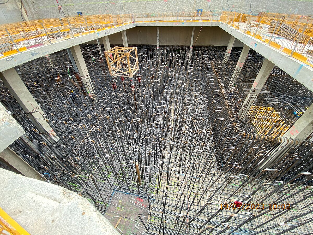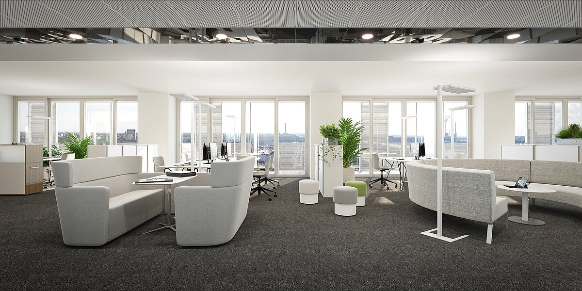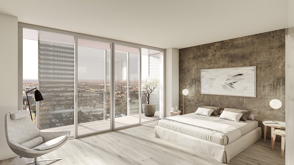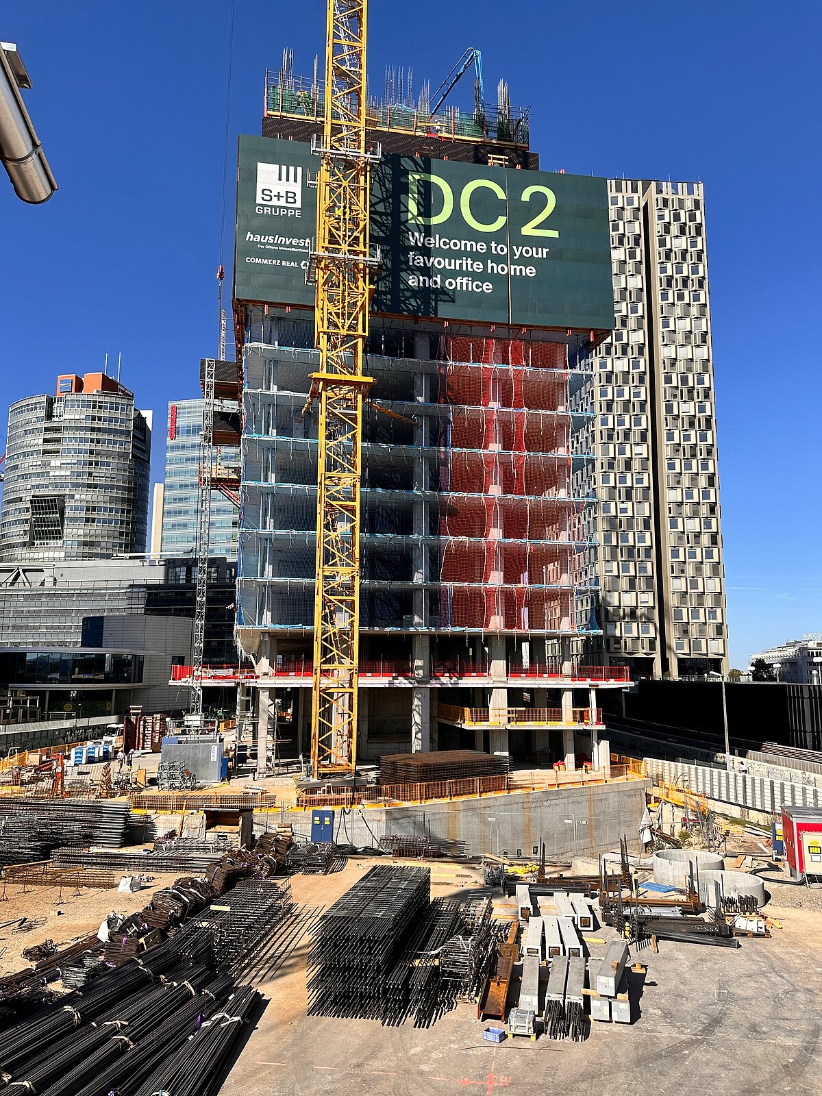 Originally designed as a twin tower to DC 1, the tower was redesigned by Mr Perrault on the advice of the Advisory Board for Urban Planning and Urban Design and will have an independent face when it is completed in 2026. Wrap-around loggias will contribute greatly to the quality of life and the planned design of the façade with photovoltaic elements will be the first of its kind in a high-rise building in Europe. Modern, flexible office space will be created on 30 floors above a plinth area that will be used for catering and co-working. From a building height of 102 metres, 314 rental flats with different floor plans will be built. Following a successful start to construction with the special civil engineering work in the first quarter of 2022, the floor slab was concreted in autumn 2023, laying the foundation for the height increase. In spring 2024, the wind shield for the building construction work was installed and the floor-by-floor growth can now be easily tracked. In 2026, the 53-storey building will be handed over to the owner Commerz Real, which acquired the development back in 2016 for the open-ended property fund hausinvest.