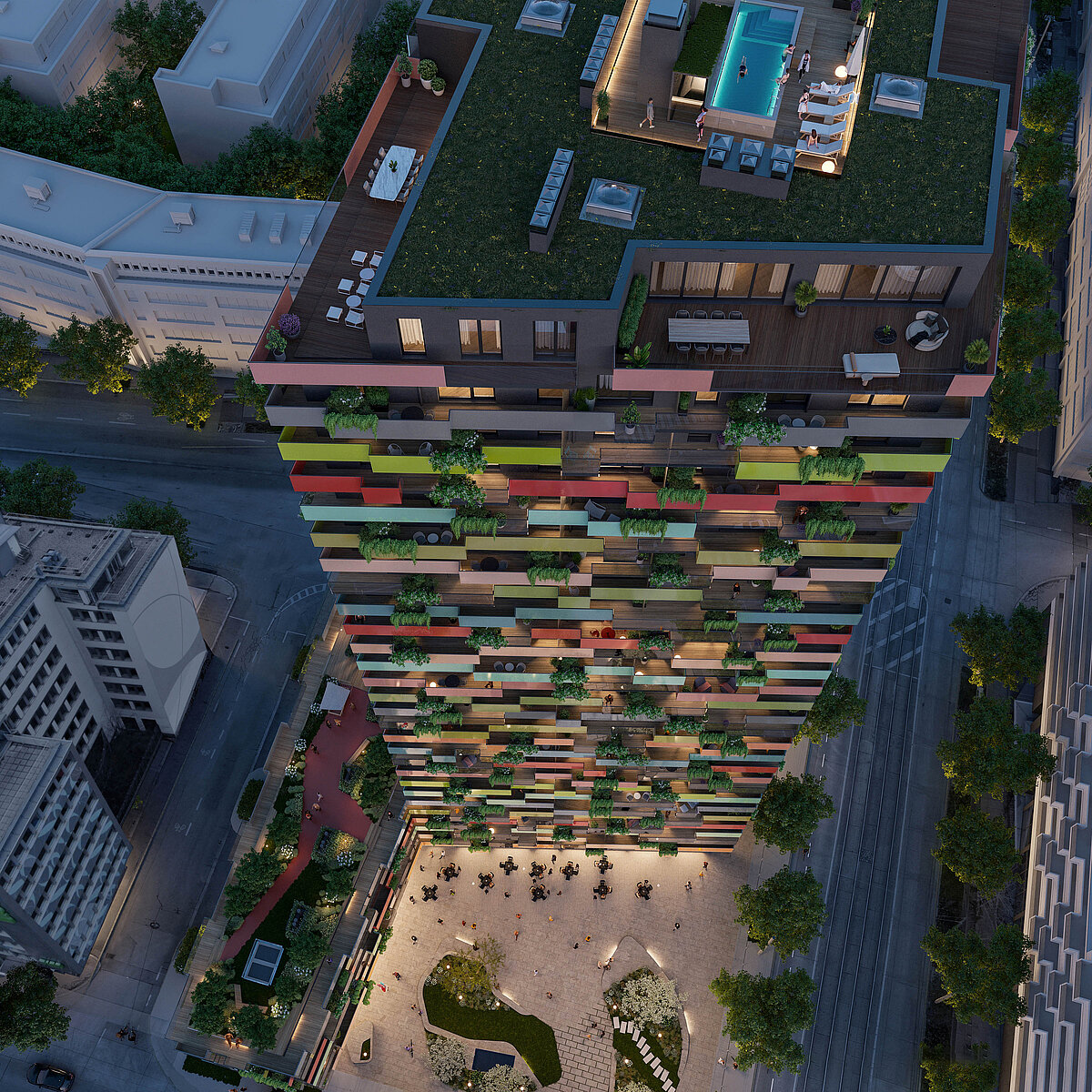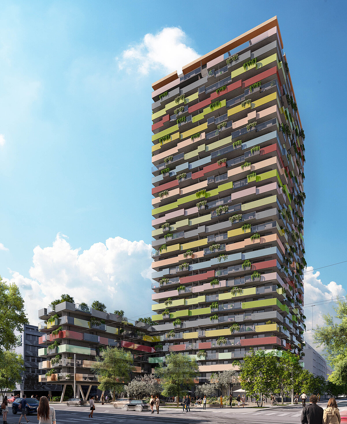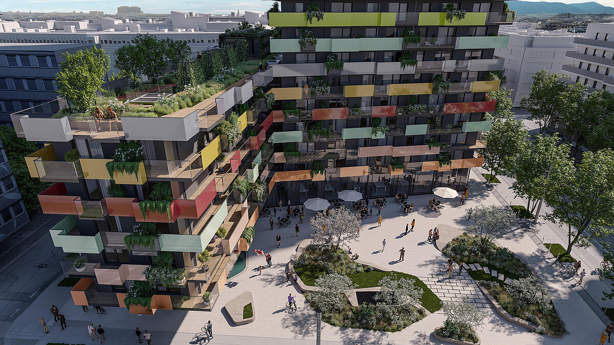 Dostęp do „Zielonego Centrum” został wyeksponowany dzięki dwóm efektownym, tętniącym życiem kolorowym budynkom mieszkalnym w pobliżu stacji kolejki podmiejskiej – Traisengasse. Jednym z dwóch budynków jest projekt naszego wspaniałego wysokościowca – Dresdner Strasse 90. Nieruchomość została zakupiona pod koniec 2018 roku. Rozpoczęcie budowy planowane jest na koniec 2021 roku.
